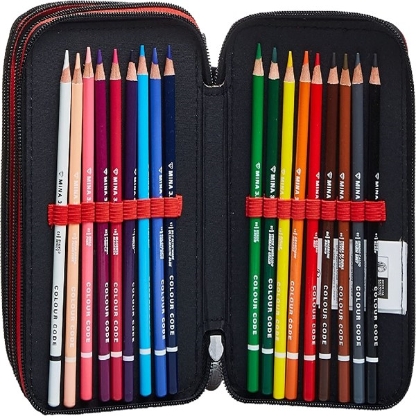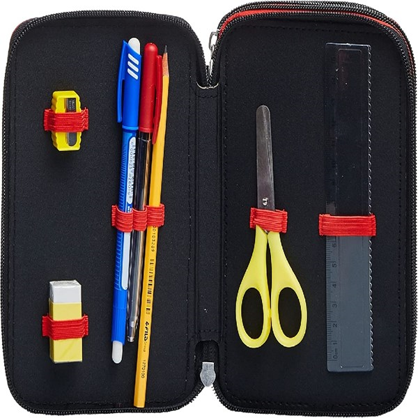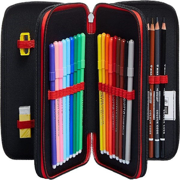 Descrizione ? DIMENSIONI: 12,5 x 19,5 x 7 cm CONTENUTO: 1 penna cancellabile Tratto Cancellik – colore blu, 1 penna a sfera Tratto 1UNO – colore rosso, 18 pastelli Colour Code, 18 pennarelli Giotto Turbo Color, 1 matita grafite Fila, 1 gomma, 1 temperino, 1 righello trasparente, 1 forbice in metallo con maniglia in plastica. TASCHE: Triplo scomparto con zip. ALTRE CARATTERISTICHE: Apertura 3 scomparti con cerniera, serigrafia su fronte, inserti in rete imbottita, zip bicolore, tirazip personalizzati, profili a contrasto. Etichetta logo MILAN in gomma.