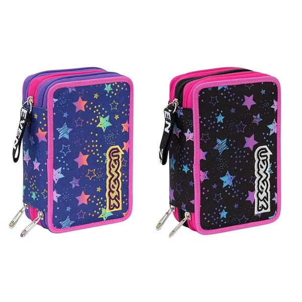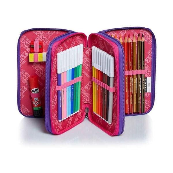 Astuccio con cancelleria Seven Dance Party Astuccio Seven accessoriato con cancelleria e 3 zip Caratteristiche: elastici interni porta penne, realizzato in poliestere Contenuto: 1 penna cancellabile Pilot Frixion blu, 18 pastelli a colori Giotto Supermina, 18 pennarelli Giotto Turbocolor, 1 colla stick Pritt, 1 penna Fila rossa, 1 evidenziatore Fila Turbofluo, 1 matita Lyra Temagraph, 1 gomma, 1 temperino, 1 righello, 1 goniometro, 1 forbice. Dimensioni: 20x12x7 cm
