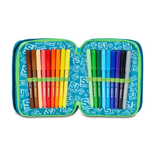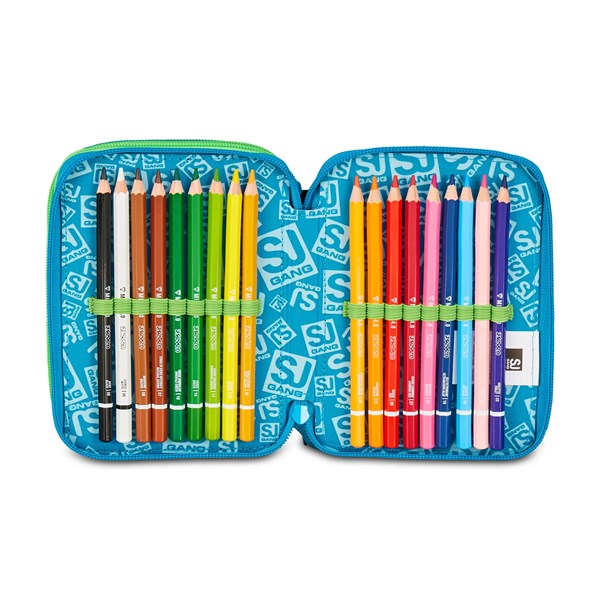 Astuccio 3 zip SJ Gang. Dotato di 3 scomparti completi di tutto il materiale necessario per fare al meglio i tuoi lavori di scuola, puoi abbinarmi a uno zaino o a un trolley SJ Gang. Dimensioni 12,5 x 20 x 7 cm Altre caratteristiche CONTENUTO 45 PEZZI: 1 penna cancellabile blu Frixion, 1 penna sfera rossa, 18 pastelli a colore MINAPRO 4.0, 18 pennarelli PUNTAPRO 3.0, 1 matita grafite esagonale HB, 1 colla gialla azzurra, 1 gomma bianca con cartoncino stampato, 1 temperino barilotto 2 fori, 1 righello trasparente, 1 matita bicolor rosso/BLU, 1 paio di forbici in metallo Tasche Triplo scomparto Tessuto Poliestere
