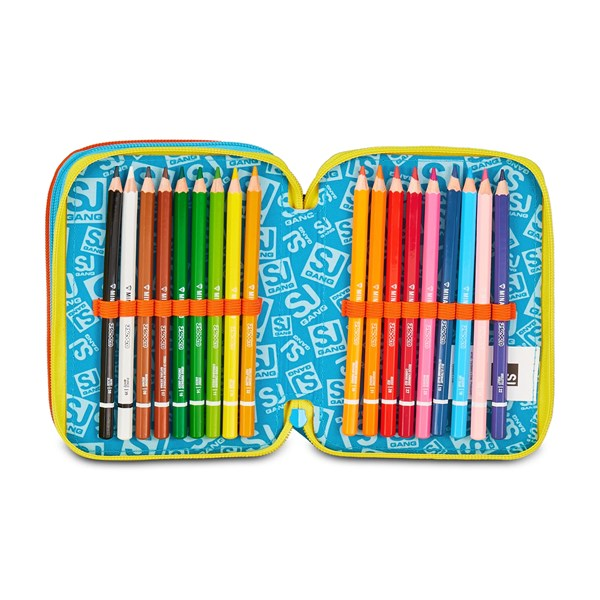Astuccio 3 zip SJ Gang. Dotato di 3 scomparti completi di tutto il materiale necessario per fare al meglio i tuoi lavori di scuola, puoi abbinarmi a uno zaino o a un trolley SJ Gang. Dimensioni 12,5 x 20 x 7 cm Altre caratteristiche CONTENUTO 45 PEZZI: 1 penna cancellabile blu Frixion, 1 penna sfera rossa, 18 pastelli a colore MINAPRO 4.0, 18 pennarelli PUNTAPRO 3.0, 1 matita grafite esagonale HB, 1 colla gialla azzurra, 1 gomma bianca con cartoncino stampato, 1 temperino barilotto 2 fori, 1 righello trasparente, 1 matita bicolor rosso/BLU, 1 paio di forbici in metallo Tasche Triplo scomparto Tessuto Poliestere