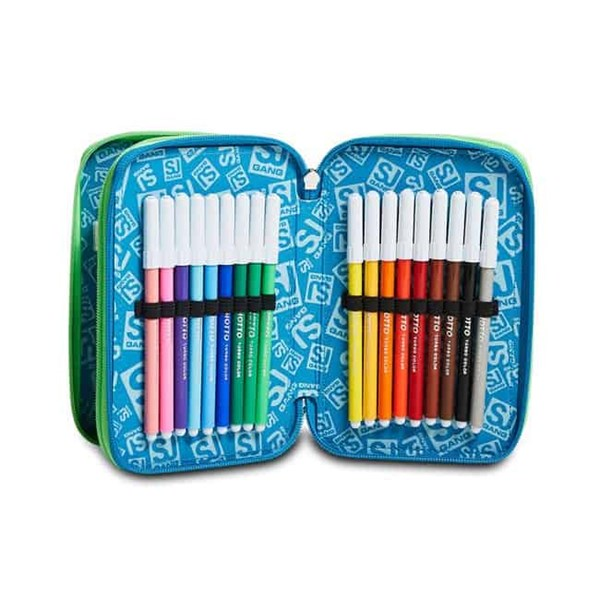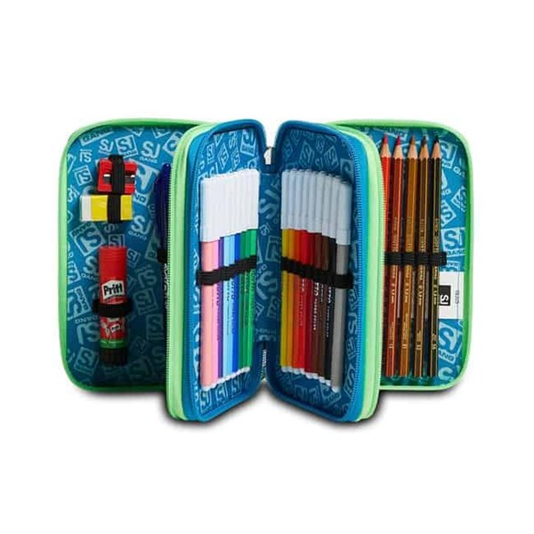 Caratteristiche: Dimensioni 20 x 12,5 x 7 cm CONTENUTO: 1 penna cancellabile blu, 1 penna rossa, 36 pastelli a colori, 1 colla stick, 1 matita, 1 gomma, 1 temperino, 1 righello, 1 goniometro, 1 forbice. Triplo scomparto. Tessuto Poliestere