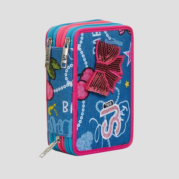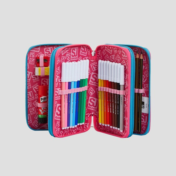 L’Astuccio 3 zip SJ Gang con un fantastico patch a fiocco in paillettes e 3 scomparti completi di tutto il materiale necessario per fare al meglio i tuoi lavori di scuola: 1 penna a sfera cancellabile PILOT FRIXION con inchiostro di colore blu, 1 penna a sfera FILA TRATTO 1UNO GRIP con inchiostro di colore rosso, 18 pastelli a colori GIOTTO SUPERMINA, 18 pennarelli GIOTTO TURBO COLOR, 1 colla stick PRITT, 1 matita grafite LYRA TEMAGRAPH, 1 gomma, 1 temperino, 1 righello trasparente, 1 goniometro trasparente, 1 forbice. Le grafiche sono coloratissime. Abbinalo a uno zaino o a un trolley SJ Gang.